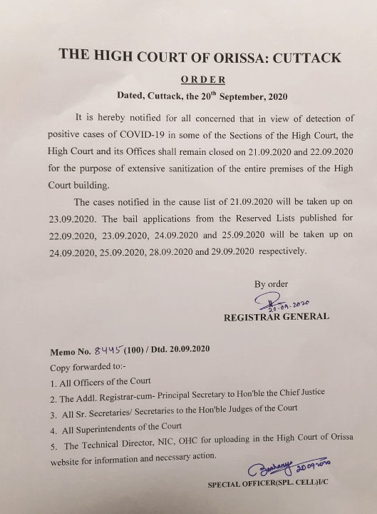 କଟକ: ଆସନ୍ତାକାଲି ଠାରୁ ୨ ଦିନ ପର୍ଯ୍ୟନ୍ତ ବନ୍ଦ ରହିବ ଓଡ଼ିଶା ହାଇକୋର୍ଟ । ସେପ୍ଟେମ୍ବର ୨୧ ଓ ୨୨ ତାରିଖରେ ହାଇକୋର୍ଟ ବନ୍ଦ ନେଇ ରେଜିଷ୍ଟ୍ରାର ଜେନେରାଲ ନିର୍ଦେଶ ଦେଇଛନ୍ତି । ନିର୍ଦେଶ ଅନୁସାରେ ହାଇକୋର୍ଟ ସହ ଏହାର କାର୍ଯ୍ୟାଳୟ ମଧ୍ୟ ବନ୍ଦ ରହିବ । କିଛି ବିଭାଗରେ କରୋନା ସଂକ୍ରମିତଙ୍କ ସଂଖ୍ୟା ବଢ଼ିଥିବାରୁ ଏଭଳି ନିଷ୍ପତ୍ତି ହୋଇଛି । ହାଇକୋର୍ଟ ପରିସରକୁ ସାନିଟାଇଜ କରିବାକୁ ନିର୍ଦେଶନାମାରେ କୁହାଯାଇଛି।