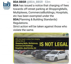 ବିଡିଏ ପକ୍ଷରୁ ଜାରି ସୂଚନା ଅନୁସାରେ ବିଭିନ୍ନ ସପିଂ ମଲ୍ , ମଲଟିପ୍ଲେକ୍ସ, ଆପାର୍ଟମେଣ୍ଟ୍ ଓ ହସ୍ପିଟାଲରେ ଗାଡି ପାର୍କ କରିବା ବାବଦରେ ସାଧାରଣ ଲୋକଙ୍କଠୁ ପାର୍କିଂ ଫି’ ଆଦାୟ କରାଯାଉଥିବା ‘ବିଡିଏ’ର ଦୃଷ୍ଟି ଗୋଚର ହୋଇଛି । ‘ବିଡିଏ’ ନିୟମର ଦୃଷ୍ଟି କୋଣରୁ ଏହାକୁ ବେଆଇନ ଦର୍ଶାଇ ଆଦାୟ କରାଯାଉଥିବା ପାର୍କିଂ ଫି’କୁ ତୁରନ୍ତ ବନ୍ଦ କରିବାକୁ ବିଡିଏ ନିର୍ଦ୍ଦେଶ ଦେଇଛି।