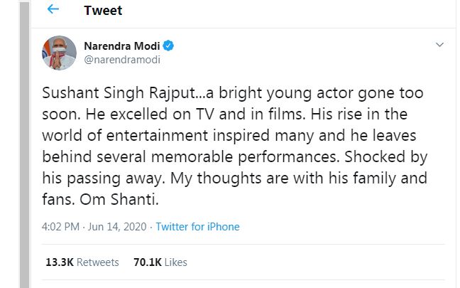 ସେ ଟ୍ୱିଟ୍ କରି ଲେଖିଛନ୍ତି ଯେ, ମନୋରଂଜନ ଜଗତର ଜଣେ ଉଜ୍ୱଳ ତାରକା ଖବୁଶୀଘ୍ର ଆମକୁ ଛାଡି ଚାଲିଗଲେ । ଟେଲିଭିଜନ ଓ ଫିଲ୍ମ ଜଗତରେ ସୁଶାନ୍ତ ଜଣେ ବେଶ ସଫଳ ଅଭିନେତା ଥିଲେ । ସୁଶାନ୍ତଙ୍କ ସଫଳତା ବଲିଉଡ ଜଗତରେ ଅନେକଙ୍କୁ ପ୍ରେରଣା ଯୋଗଇବ । ତାଙ୍କ ମୃତ୍ୟୁରେ ଗଭୀର ଭାବେ ଦୁଃଖିତ ଓ ମର୍ମହାତ ବୋଲି ସେ କହିଛନ୍ତି । ଭଗବାନ ତାଙ୍କ ପରିବାରକୁ ଶକ୍ତି ଦିଅନ୍ତୁ ବୋଲି ମୋଦୀ କହିଛନ୍ତି ।
