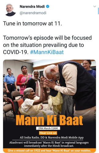 ନୂଆଦିଲ୍ଲୀ: ପ୍ରଧାନମନ୍ତ୍ରୀ ନରେନ୍ଦ୍ର ମୋଦି ଆଜି ଦିନ ୧୧ଟାରେ ‘ମନ କି ବାତ୍’ରେ ଦେଶବାସୀଙ୍କୁ ସମ୍ବୋଧନ କରିବେ । ଏଥିରେ କରୋନା ମହାମାରୀ ନେଇ ଦେଶରେ ସୃଷ୍ଟି ହୋଇଥିବା ପରିସ୍ଥିତି ସମ୍ପର୍କରେ ଆଲୋଚନା କରିବେ । ଏ ନେଇ ମୋଦି ଟ୍ୱିଟ୍ ଯୋଗେ ସୂଚନା ଦେଇଛନ୍ତି ।