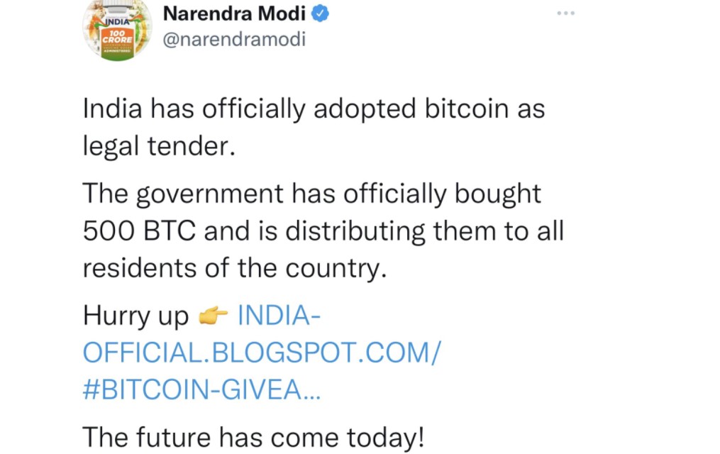 ପ୍ରଧାନମନ୍ତ୍ରୀଙ୍କ ଟ୍ୱିଟର ଆକାଉଣ୍ଟରେ ଉଲ୍ଲେଖ ରହିଥିଲା, ଭାରତ ସରକାର ବିଟ୍ କଏନ୍ର ପ୍ରଚଳନକୁ ସରକାରୀ ଭାବେ ସ୍ୱୀକାର କରିଛନ୍ତି । ସରକାର ବି ୫୦୦ ବିଟ୍ କଏନ୍ କିଣି ଲୋକଙ୍କୁ ବାଣ୍ଟୁଛନ୍ତି । ଦୁଇ ମିନିଟ୍ ଯାଏଁ ଏହି ଟ୍ୱିଟ୍ ମୋଦିଙ୍କ ଟ୍ୱିଟର ହ୍ୟାଣ୍ଡେଲରେ ରହିବା ପରେ ଡିଲିଟ୍ ହୋଇଯାଇଥିଲା।