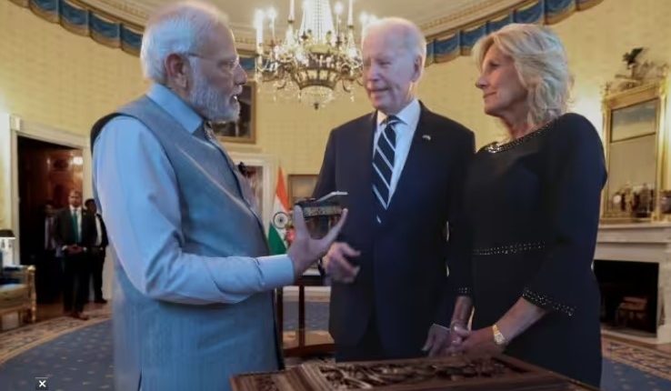 ଭାରତ ପକ୍ଷରୁ ରାଷ୍ଟ୍ରପତି ଜୋ ବାଇଡେନଙ୍କୁ ମୋଦୀ ଦେଇଥିବା ଉପହାରଗୁଡ଼ିକ ଭାରତୀୟ ସଂସ୍କୃତିର ଝଲକ ମିଳୁଛି। ତାଙ୍କୁ ଦିଆଯାଇଥିବା ଉପହାରଗୁଡ଼ିକ ଭାରତର ବିଭିନ୍ନ ରାଜ୍ୟ, ବିବିଧତା ଦେଶ ସହିତ ମିଳିତ ହୋଇଛି। ଅନ୍ୟପଟେ ରାଷ୍ଟ୍ରପତି ଜୋ ବାଇଡେନ୍ ଓ ପ୍ରଥମ ଲେଡି ଜିଲ୍ ବାଇଡେନ୍ ପ୍ରଧାନମନ୍ତ୍ରୀ ମୋଦୀଙ୍କୁ ବିଂଶ ଶତାବ୍ଦୀ ପ୍ରାରମ୍ଭ ସମୟ ଖଣ୍ଡେ ହାତ ତିଆରି ପୁରାତନ ଆମେରିକୀୟ ‘ବୁକ୍ ଗାଲି’, ଏକ ପୁରାତନ କ୍ୟାମେରା ଏବଂ ଆମେରିକୀୟ ବନ୍ୟପ୍ରାଣୀଙ୍କ ଫଟୋଚିତ୍ର ଥିବା ବୋର୍ଡ ବନ୍ଧେଇ ପୁସ୍ତକ ପ୍ରଦାନ କରିଛନ୍ତି। ସେହିପରି, ଜିଲ୍ ବାଇଡେନ୍ ପ୍ରଧାନମନ୍ତ୍ରୀ ମୋଦୀଙ୍କୁ ‘କଲେକ୍ଟେଡ୍ ପୋଏମ୍ସ୍ ଅଫ୍ ରବର୍ଟ ଫ୍ରଷ୍ଟ୍’ ପୁସ୍ତକର ପ୍ରଥମ ସଂସ୍କରଣର ଖଣ୍ଡେ କପି ସ୍ବାକ୍ଷର କରି ଭେଟି ଦେଇଛନ୍ତି।