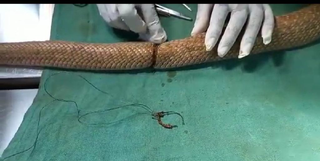 ଉଦ୍ଧାର କଲା ବେଳେ ସାପଟିର ଲାଞ୍ଜଠାରୁ ପ୍ରାୟ ଏକ ଫୁଟ ଦୂରରେ ଏକ ପ୍ଲାଷ୍ଟିକ ଡୋରରେ ଗୁଡେଇ ହୋଇ ଚିପି ହୋଇଯାଇଥିବା ଏହି ସାପଟିକୁ ସ୍ନେକ ହେଲ୍ପ ଲାଇନ କାର୍ଯ୍ୟାଳୟ ଅଣାଯାଇଥିଲା । ଓୟୁଏଟିସ୍ଥିତ ଭେଟେରିନାରୀ କଲେଜରେ ସର୍ଜରୀ ବିଭାଗର ପ୍ରଫେସର ଡାକ୍ତର ଇନ୍ଦ୍ରମଣୀ ନାଥ ଅପରେସନ କରି ପ୍ଲାଷ୍ଟିକ ଡୋରିଟିକୁ ବାହାର କରିଥିଲେ ।ସର୍ଜରୀ ପୂର୍ବରୁ ସାପର ଶରୀରର ଭିତର କ୍ଷତ ଅବସ୍ଥା ଜାଣିବା ପାଇଁ ସାପଟିର ଏକ୍ସରେ କରାଯାଇଥିଲା । ଅପରେଶନ ପରେ ସାପକୁ ଆଣ୍ଟିବାୟୋଟିକ ଇଂଜେକସନ ମଧ୍ୟ ଦିଆଯାଇଛି । ସାପଟିର ଅବସ୍ଥା ଭଲ ଅଛି, କିନ୍ତୁ ପ୍ଲାଷ୍ଟିକ ଡୋର ତାର ଚମଡା ଓ ମାଂସକୁ କାଟି ଦେଇଥିବାରୁ କ୍ଷତ ସ୍ଥାନ ଶୁଖିବା ପର୍ୟ୍ୟନ୍ତ ଅବଜରଭେସନରେ ରଖାଯିବ ବୋଲି ଡାକ୍ତର ନାଥ କହିଛନ୍ତି । ଏହି ଅପରେସନ ସମୟରେ ସ୍ନେକ ହେଲ୍ପ ଲାଇନ ସଦସ୍ୟ ସିଲକା ସେଲୋନୀ ସହାୟତା କରିଥିଲେ ।