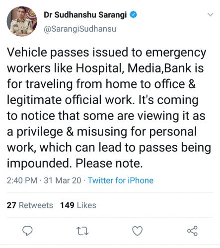 ଭୁବନେଶ୍ୱର: ଜରୁରୀକାଳୀନ ସେବା ପାଇଁ ଦିଆଯାଇଥିବା ଯାନବାହାନ ପାସ୍ର ଅପବ୍ୟବହାର ହେଉଛି । ହସ୍ପିଟାଲ, ମିଡିଆ ଓ ବ୍ୟାଙ୍କ କର୍ମଚାରୀଙ୍କ ପାଇଁ କେବଳ ଘରୁ ଅଫିସକୁ ଯାତାୟତ ପାଇଁ ଦିଆଯାଇଥିବା ପାସ୍ର ଲୋକେ ଅପବ୍ୟବହାର କରୁଥିବା ଆଜି ପୋଲିସ କମିଶନର ସୁଧାଂଶୁ ଷଡଙ୍ଗୀ ଟ୍ୱିଟରରେ ସୂଚନା ଦେଇଛନ୍ତି ।