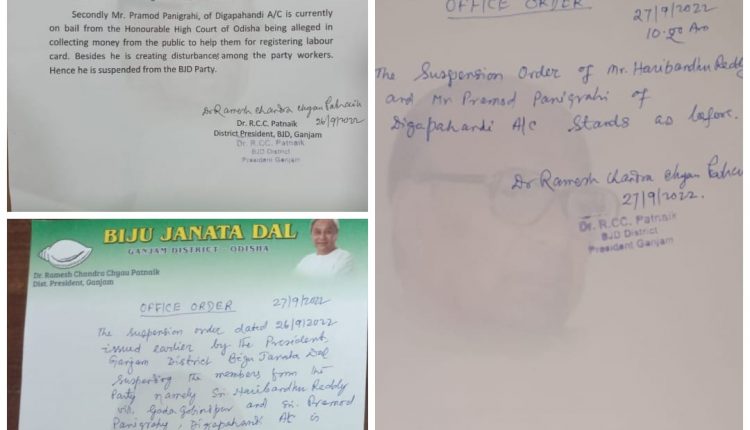 ଏହା ଭିତରେ ସୋମବାର ଗଞ୍ଜାମ ଜିଲା ବିଜେଡ଼ି ସଭାପତି ଡା.ରମେଶ ଚନ୍ଦ୍ର ଚ୍ୟାଉପଟ୍ଟନାୟକଙ୍କ ତରଫରୁ ଏକ ନିଲମ୍ବନ ନିର୍ଦେଶ ଜାରି ହୋଇଥିଲା। ଯେଉଁଥିରେ ଉଭୟ ହରିବନ୍ଧୁ ଏବଂ ପ୍ରମୋଦଙ୍କୁ ଦଳରୁ ନିଲମ୍ବନ କରାଯାଇଥିବା ଦର୍ଶାଯାଇଥିଲା। କାହିଁକି ସେମାନଙ୍କୁ ନିଲମ୍ବନ କରାଯାଇଛି, ତାହାର କାରଣ ମଧ୍ୟ ସ୍ପଷ୍ଟ କରାଯାଇଥିଲା। ହରିବନ୍ଧୁ ଦଳ ଭିତରେ ବିଶୃଙ୍ଖଳା ସୃଷ୍ଟି କରିବା ସହ ବରିଷ୍ଠ ନେତାଙ୍କୁ ସମାଲୋଚନା କରୁଥିବ ଯୋଗୁ ତାଙ୍କୁ ନିଲମ୍ବନ କରାଯାଇଥିବା ଲେଖାଥିଲା। ସେହିଭଳି ପ୍ରମୋଦ ଶ୍ରମ କାର୍ଡ କରାଇଦେବା ପାଇଁ ଲୋକମାନଙ୍କ ଠାରୁ ଚାନ୍ଦା ନେଉଥିବା ଏବଂ ଏସଂପର୍କିତ ଏକ ମାମଲାରେ ହାଇକୋର୍ଟରୁ ଜାମିନ୍ରେ ଅଛନ୍ତି। ଏଥି ସହିତ ଦଳ ଭିତରେ ବିଶୃଙ୍ଖଳା ସୃଷ୍ଟି କରୁଥିବା ଯୋଗୁ ନିଲମ୍ବନ କରାଯାଇଥିବା ଉଲ୍ଲେଖ ରହିଥିଲା। କିନ୍ତୁ ମଙ୍ଗଳବାର ଜିଲା ସଭାପତି ଡା. ଚ୍ୟାଉପଟ୍ଟନାୟକଙ୍କ ତରଫରୁ ଆଉ ଏକ ନିର୍ଦେଶ ଜାରି ହୋଇଥିଲା, ଯେଉଁଥିରେ ଉଭୟଙ୍କ ନିଲମ୍ବନ ଆଦେଶକୁ ପ୍ରତ୍ୟାହାର କରାଯାଇଥିବା ନେଇ ଉଲ୍ଲେଖ ରହିଥିଲା। ଦୁଇ ଦିନ ଭିତରେ ପ୍ରଥମେ ନିଲମ୍ବନ ଏବଂ ପରେ ପ୍ରତ୍ୟାହାର ନିର୍ଦେଶକୁ ନେଇ ସାରା ଜିଲାରେ ରାଜନୈତିକ ଚର୍ଚ୍ଚା ଦେଖାଦେଇଥିଲା। ଯେଉଁ ଦୁଇ ନେତାଙ୍କ ବିରୋଧରେ ସଙ୍ଗୀନ ଅଭିଯୋଗ ଆଣି ଦଳରୁ ନିଲମ୍ବନ କରାଯାଇଥିଲା, ହଠାତ୍ ପୁଣି ଥରେ ଦଳ ତାଙ୍କୁ କୋଳାଇ ନେବା ଯୋଗୁ ପ୍ରଶ୍ନବାଚୀ ସୃଷ୍ଟି ହୋଇଥିଲା। ତେବେ ଏହି ଚର୍ଚ୍ଚା ଭିତରେ ଡା. ଚ୍ୟାଉପଟ୍ଟନାୟକ ମଙ୍ଗଳବାର ସକାଳେ ହିଁ ଆଉ ଏକ ନିର୍ଦେଶ ଜାରି କରିଥିଲେ। ଉଭୟ ନେତାଙ୍କ ନିଲମ୍ବନ ଆଦେଶ ବଳବତ୍ତର ରହିବ ବୋଲି ଏଥିରେ କୁହାଯାଇଥିଲା। ଏଣୁ ପ୍ରଥମେ ନିଲମ୍ବନ ପରେ ପ୍ରତ୍ୟାହାର ଏବଂ ପୁଣି ଥରେ ନିଲମ୍ବନକୁ ନେଇ ବଡ଼ ବିବାଦ ସୃଷ୍ଟି ହୋଇଛି। ବିପିନ ଏବଂ ବିପ୍ଳବ ଗୋଷ୍ଠୀ ଭିତରେ ଯେଉଁ ଶୀତଳ ଯୁଦ୍ଧ ଚାଲିଛି, ତାହା ଆଗାମୀ ଦିନରେ ଦଳକୁ କ୍ଷତିରେ ପକାଇବ ବୋଲି ମଧ୍ୟ ଆଲୋଚନା ହେଉଛି।