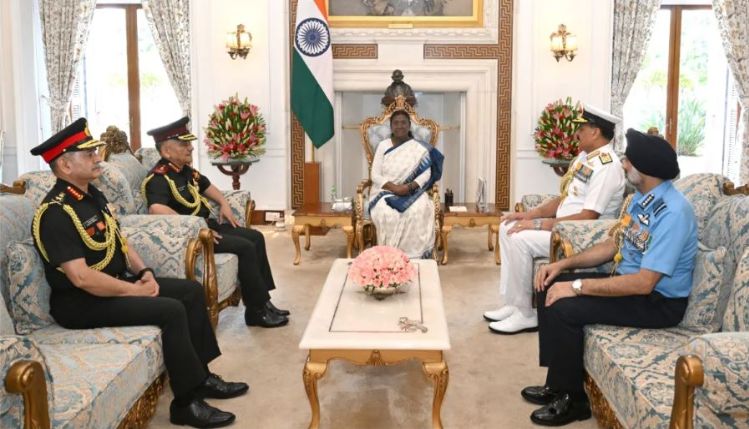 General Anil Chauhan, Chief of Defence Staff, along with General Upendra Dwivedi, Chief of the Army Staff, Air Chief Marshal A. P. Singh, Chief of the Air Staff, and Admiral Dinesh K. Tripathi, Chief of the Naval Staff, called on President Droupadi Murmu and briefed her about… pic.twitter.com/ZU3GcK5Vux