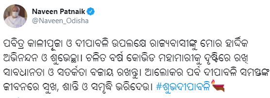 ସେହିପରି ପବିତ୍ର କାଳୀପୂଜା ଓ ଦୀପାବଳି ଉପଲକ୍ଷେ ରାଜ୍ୟବାସୀଙ୍କୁ ଶୁଭେଚ୍ଛା ଜଣାଇଛନ୍ତି ମୁଖ୍ୟମନ୍ତ୍ରୀ ନବୀନ ପଟ୍ଟନାୟକ । ଟ୍ୱିଟ୍ କରି ମୁଖ୍ୟମନ୍ତ୍ରୀ ଚଳିତ ବର୍ଷ କୋଭିଡ ମହାମାରୀକୁ ଦୃଷ୍ଟିରେ ରଖି ସାବଧାନତା ଓ ସତର୍କତା ବଜାୟ ରଖିବାକୁ ଅନୁରୋଧ କରିଛନ୍ତି । ରାଜ୍ୟବାସୀଙ୍କ ସୁଖ, ଶାନ୍ତି ଓ ସମୃଦ୍ଧି କାମନା କରିଛନ୍ତି ।