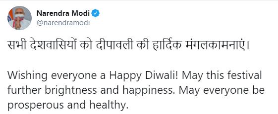ସେହିପରି ପ୍ରଧାନମନ୍ତ୍ରୀ ନରେନ୍ଦ୍ର ମୋଦି ବି ଦେଶବାସୀଙ୍କୁ ଦୀପାବଳିର ଶୁଭେଚ୍ଛା ଜଣାଇଛନ୍ତି । ଟ୍ୱିଟ୍ କରି ପ୍ରଧାନମନ୍ତ୍ରୀ ଲେଖିଛନ୍ତି, ଆଲୋକର ପର୍ବ ସମସ୍ତଙ୍କ ଜୀବନକୁ ଅଧିକ ଉଜ୍ଜ୍ୱଳ କରିବା ସହ ସୁଖ ଭରିଦେଇ । ଦେଶବାସୀଙ୍କ ସୁଖ ସମୃଦ୍ଧି ଓ ସୁସ୍ଥତା କାମନା କରିଛନ୍ତି ପ୍ରଧାନମନ୍ତ୍ରୀ ।