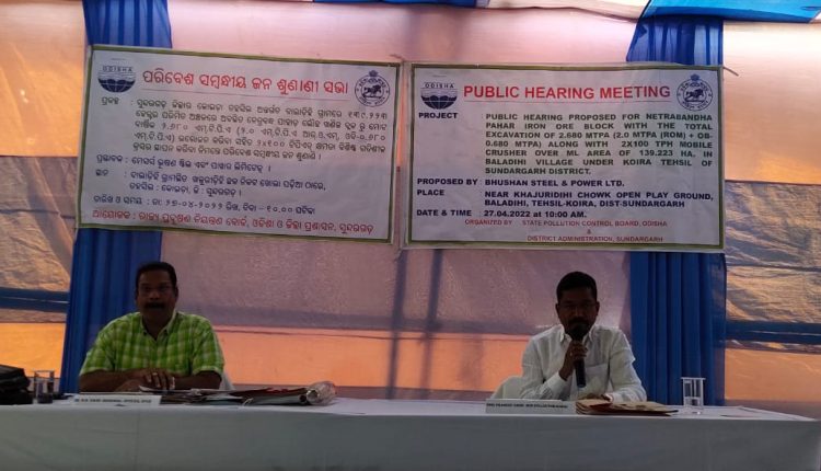 କୋଇଡ଼ା: ନେତ୍ରବନ୍ଧ ଆଇରନ୍ ଓର୍ ଖଣି ରେ ଜେଏସଡବ୍ଲୁ ସହଯୋଗୀ ଭୂଷଣ ଷ୍ଟିଲ୍ ଏବଂ ପାୱାର ଲିମିଟେଡ ର ଖନନ ପାଇଁ ବୁଧବାର ବାଲାଡିହି ଗ୍ରାମରେ ପଲ୍ଲୀ ସଭା ବା ଜନ ଶୁଣାଣି ଅନୁଷ୍ଠିତହୋଇଯାଇଛି। ସ୍ଥାନୀୟ ଲୋକ ପ୍ରତିନିଧି ମାନଙ୍କ ସହ ପ୍ରଭାବିତ ଗ୍ରାମର ୫୦୦ ଜଣ ଏହି ସଭାରେ କମ୍ପାନୀ କର୍ତ୍ତୃପକ୍ଷଙ୍କ ସହ ଆଲୋଚନା କରିଛନ୍ତି।