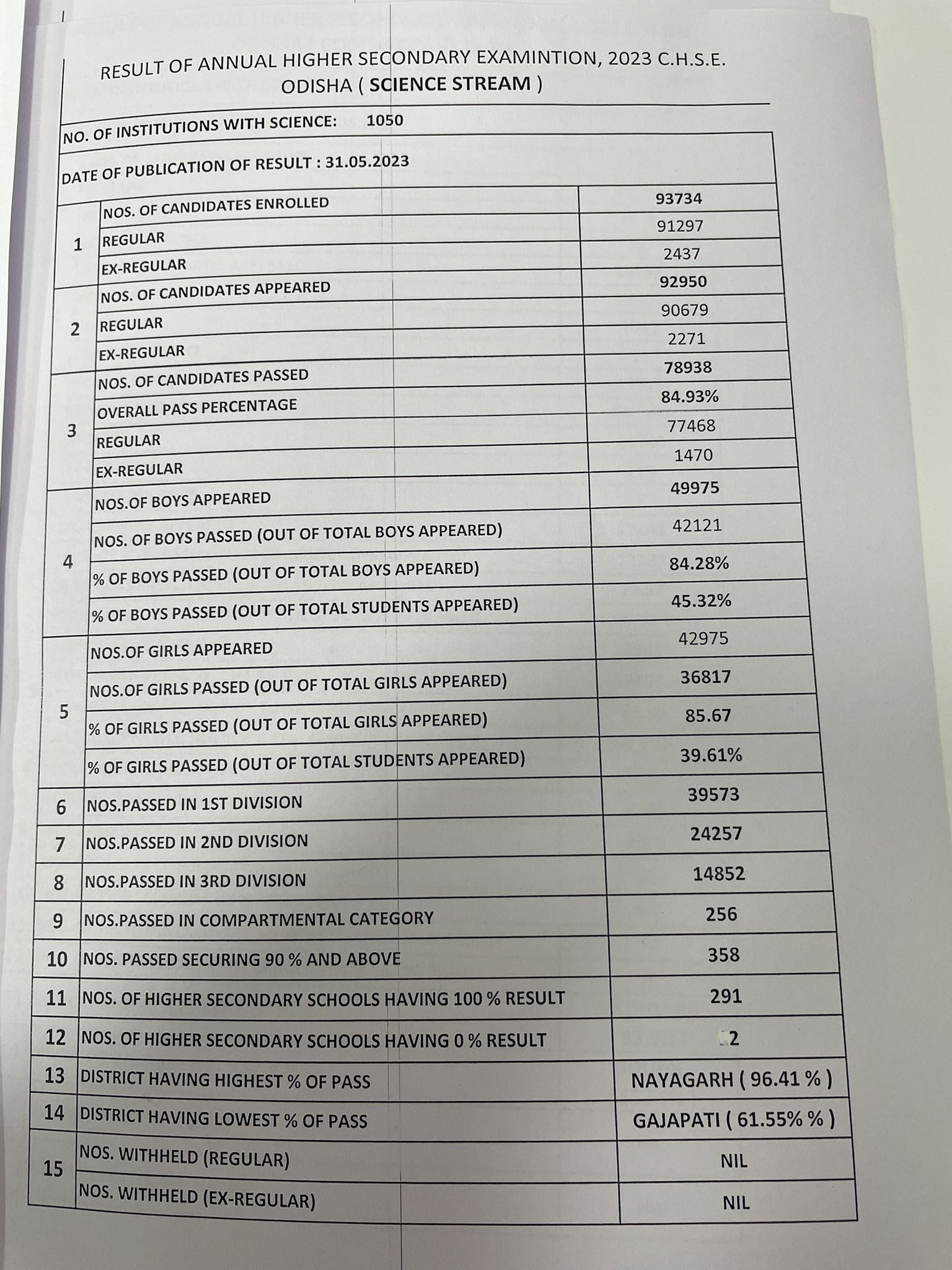 ଯୁକ୍ତ ଦୁଇ ବିଜ୍ଞାନ ଓ ବାଣିଜ୍ୟରେ ନୟାଗଡରେ ସର୍ବାଧିକ ପାସ ହାର ରହିିଛି । ବିଜ୍ଞାନରେ ଏହି ଜିଲ୍ଲାରେ ପାସହାର ୯୬.୪୧ ପ୍ରତିଶତ ଥିବାବେଳେ ବାଣିଜ୍ୟରେ ପାସ ହାର ୯୩.୯ ପ୍ରତିଶତ ରହିଛି । ସେହିପରି ବିଜ୍ଞାନରେ ଗଜପତି ଜିଲ୍ଲାରେ ସର୍ବନିମ୍ନ ପାସ ହାର ୬୧.୫୫ ପ୍ରତିଶତ ରହିଥିବାବେଳେ ବାଣିଜ୍ୟରେ ବୌଦ୍ଧ ଜିଲ୍ଲାରେ ରହିଛି ସର୍ବନିମ୍ନ ପାସ ହାର । ବୌଦ୍ଧ ଜିଲ୍ଲାରେ ସର୍ବନିମ୍ନ ପାସ ହାର ରହିଛି ୫୫.୫୫ ପ୍ରତିଶତ ।