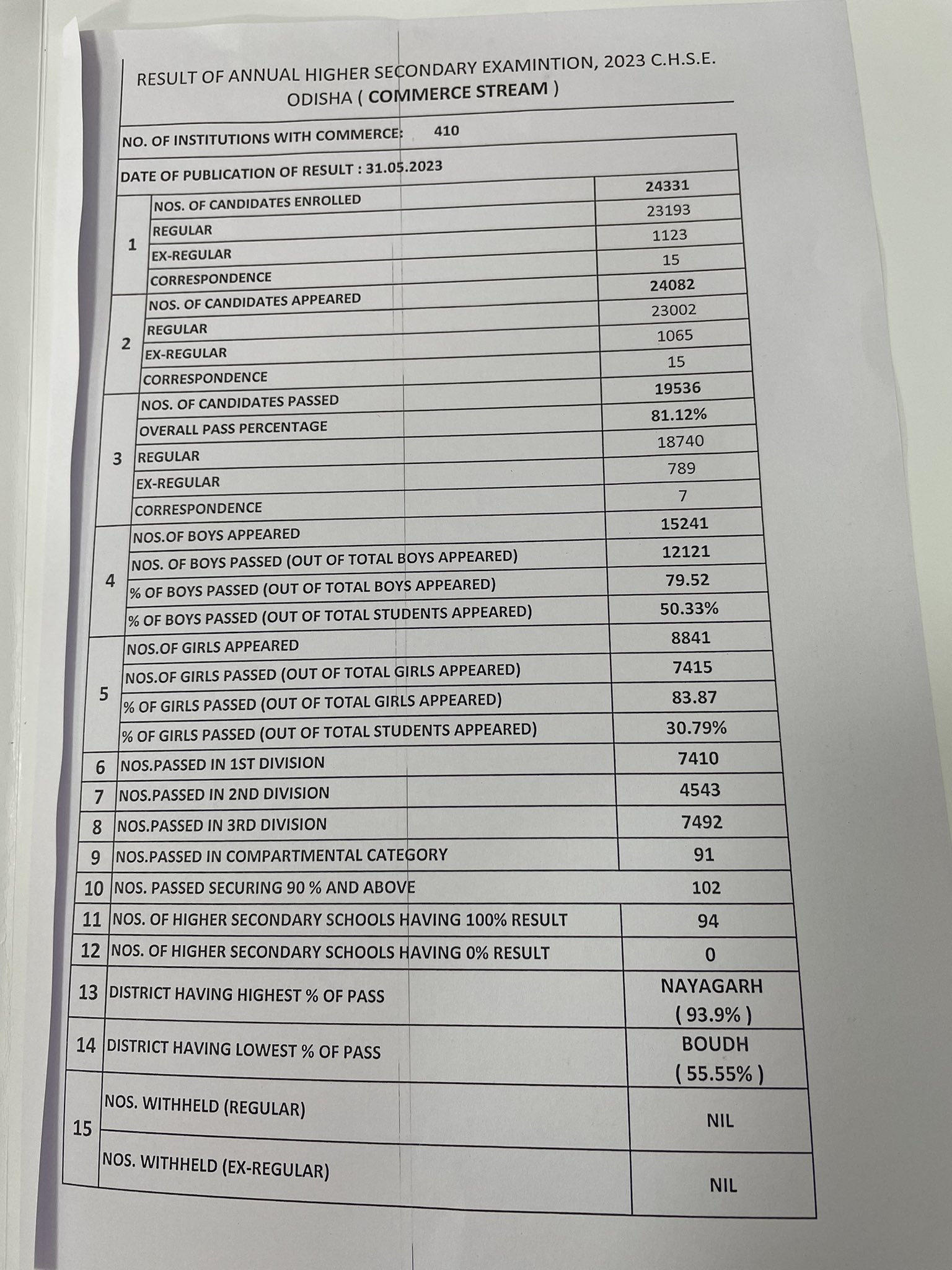 ସେହିପରି ବାଣିଜ୍ୟରେ ମୋଟ୍ ପରୀକ୍ଷାର୍ଥୀ ୨୪,୦୮୨ଙ୍କ ମଧ୍ୟରୁ ୧୯,୫୩୬ ଜଣ ଛାତ୍ରଛାତ୍ରୀ ପାସ୍ କରିଛନ୍ତି। ପ୍ରଥମ ଶ୍ରେଣୀରେ ୭,୪୧୦ ଜଣ ପାସ କରିଥିବାବେଳେ ୪,୫୪୩ ଜଣ ଛାତ୍ରଛାତ୍ରୀ ୨ୟ ଶ୍ରେଣୀରେ ଏବଂ ୩ୟ ଶ୍ରେଣୀରେ ପାସ କରିଛନ୍ତି ୭୪୯୨ ଜଣ ।