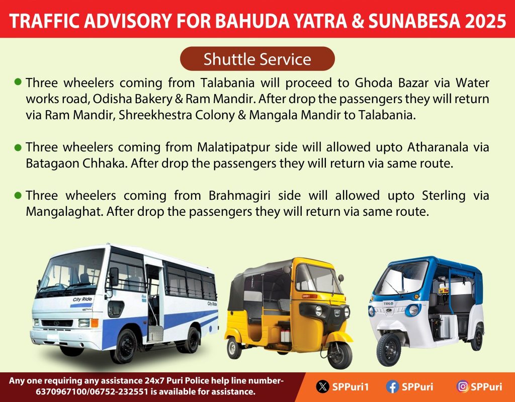 ପୁରୀ: ଜୁଲାଇ ୫ ଓ ୬ରେ ପୁରୀରେ ବାହୁଡା ଯାତ୍ରା ଏବଂ ସୁନାବେଶ ସମୟରେ ସୁଗମ ଯାନବାହାନ ଚଳାଚଳ ଏବଂ ଉତ୍ତମ ଭିଡ଼ ପରିଚାଳନା ପାଇଁ ଜିଲ୍ଲା ପୋଲିସ ଗୁରୁବାର ଏକ ଟ୍ରାଫିକ ପରାମର୍ଶ ଜାରି କରିଛି।