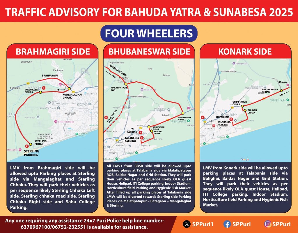 ପୁରୀ: ଜୁଲାଇ ୫ ଓ ୬ରେ ପୁରୀରେ ବାହୁଡା ଯାତ୍ରା ଏବଂ ସୁନାବେଶ ସମୟରେ ସୁଗମ ଯାନବାହାନ ଚଳାଚଳ ଏବଂ ଉତ୍ତମ ଭିଡ଼ ପରିଚାଳନା ପାଇଁ ଜିଲ୍ଲା ପୋଲିସ ଗୁରୁବାର ଏକ ଟ୍ରାଫିକ ପରାମର୍ଶ ଜାରି କରିଛି।