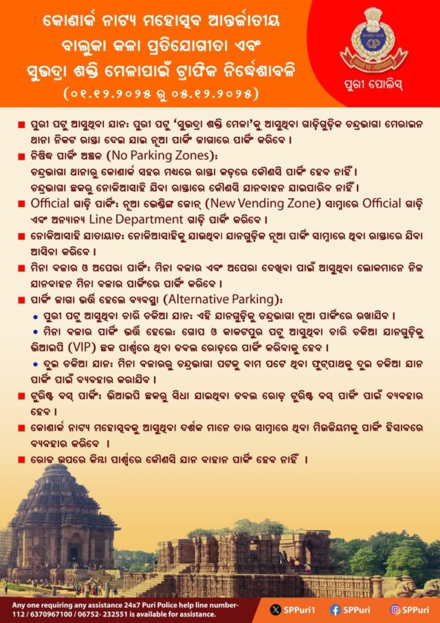 ପୁରୀ: କୋଣାର୍କ ମହୋତ୍ସବର ୩୬ତମ ସଂସ୍କରଣ ସୋମବାରଠାରୁ ଆରମ୍ଭ ହେବାକୁ ଯାଉଛି। ଯାହାକୁ ନଜରରେ ରଖି ପୁରୀ ଜିଲ୍ଲା ପୋଲିସ ଯାନବାହାନର ସୁଗମ ଗତିବିଧି ସୁନିଶ୍ଚିତ କରିବା ପାଇଁ ପାଞ୍ଚ ଦିନିଆ କାର୍ଯ୍ୟକ୍ରମ ପାଇଁ ଏକ ବିସ୍ତୃତ ଟ୍ରାଫିକ୍ ପରାମର୍ଶ ଜାରି କରିଛି।