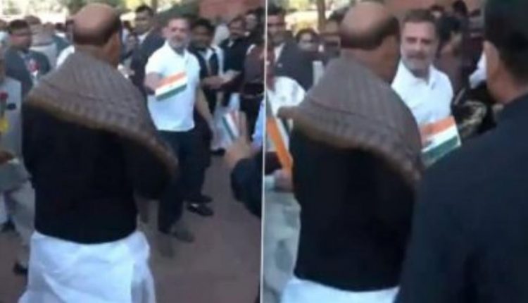 #WATCH | Delhi | In a unique protest in Parliament premises, Congress MP and LoP Lok Sabha, Rahul Gandhi gives a Rose flower and Tiranga to Defence Minister Rajnath Singh pic.twitter.com/9GlGIvh3Yz