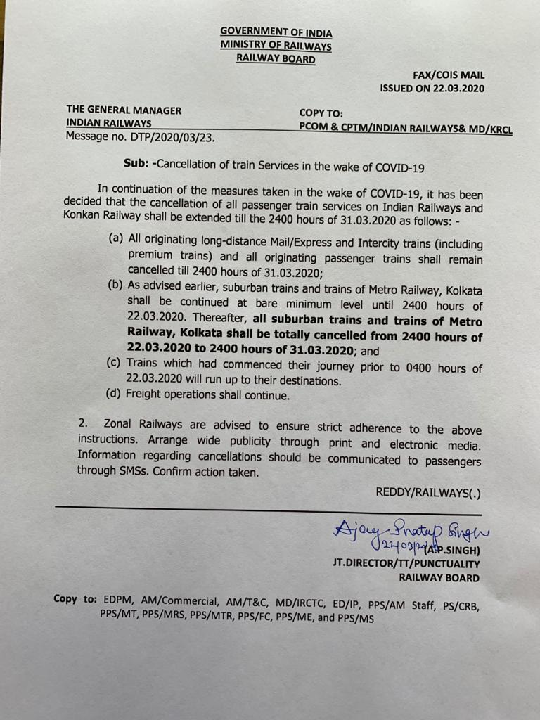 ମାର୍ଚ୍ଚ ୨୨ ତାରିଖ ଆର୍ଥାତ ଆଜି ୪ଘଣ୍ଟା ପୂର୍ବରୁ ଚଳାଚଳ ଆରମ୍ଭ କରିଥିବା ଟ୍ରେନ ନିଜ ଗନ୍ତବ୍ୟ ସ୍ଥଳୀକୁ ଯିବେ । ସାରା ଦେଶରେ ଥିବା ମାଲଗାଡି ଗୁଡିକ ଚଳାଚଳ ଜାରି ରଖିବେ ।
