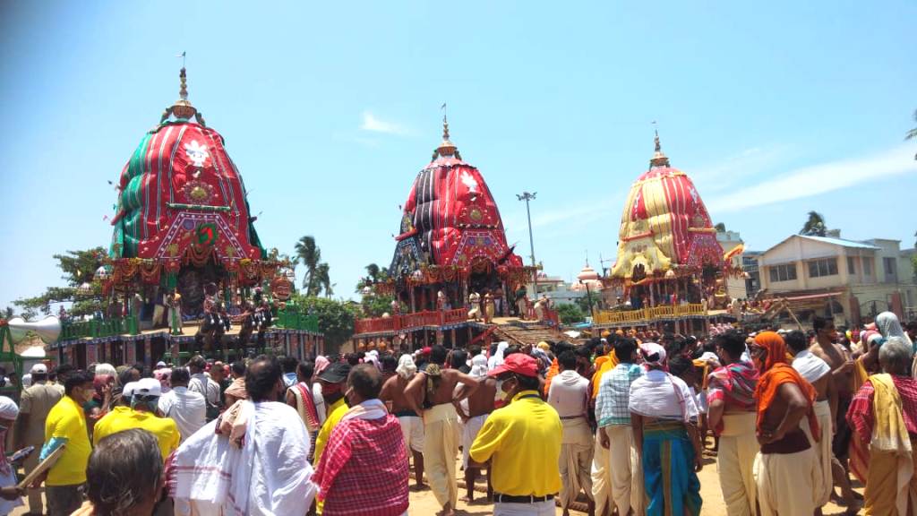 ପୁରୀ: ଶ୍ରୀମନ୍ଦିରକୁ ବାହୁଡୁଛନ୍ତି ମହାପ୍ରଭୁ ଶ୍ରୀଜଗନ୍ନାଥ । ବଡ଼ଠାକୁର ଶ୍ରୀବଳଭଦ୍ର ଓ ସୁନା ଭଉଣୀ ଦେବୀ ସୁଭଦ୍ରାଙ୍କ ସହିତ ମହାପ୍ରଭୁ ଶ୍ରୀଜଗନ୍ନାଥ ଆଜି ବାହୁଡ଼ା ଯାତ୍ରାରେ ଶ୍ରୀମନ୍ଦିର ଅଭିମୁଖେ ଯାତ୍ରା କରିଛନ୍ତି । ତିନୋଟି ରଥ ନନ୍ଦିଘୋଷ, ତାଳଧ୍ୱଜ ଏବଂ ଦେବୀ ଦଳନ ରଥ ବଡ଼ଦାଣ୍ଡ ଶ୍ରୀମନ୍ଦିରର ନିକଟବର୍ତ୍ତୀ ହୋଇଛନ୍ତି । ସେବାୟତମାନେ ତିନୋଟି ରଥକୁ ଅତ୍ୟନ୍ତ ଶୃଙ୍ଖଳାର ସହିତ ଟାଣି ଟାଣି ନେଇଯାଇଛନ୍ତି ।