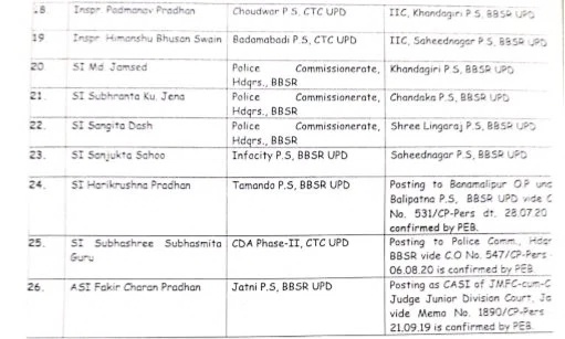 ଭୁବନେଶ୍ୱର: କମିଶନରେଟ୍ ପୋଲିସ ସୋମବାର ଦିନ କଟକ ଓ ଭୁବନେଶ୍ୱରର ଅତିରିକ୍ତ ଡିସିପି, ଇନସପେକ୍ଟର, ଏସଆଇ ସ୍ତରରେ ଅଦଳ ବଦଳ କରିଛନ୍ତି ।