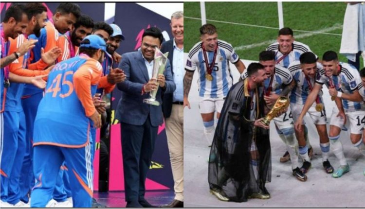 କିଙ୍ଗଷ୍ଟନ ଓଭାଲ: ଟି୨୦ ବିଶ୍ୱକପ ୨୦୨୪ ଫାଇନାଲରେ ଦକ୍ଷିଣ ଆଫ୍ରିକାକୁ ହରାଇ ଭାରତ ଚାମ୍ପିୟନ ହୋଇଛି । ଏଥିସହ ୨୦୧୧ ପରେ ଭାରତ ଆଇସିସି ଟ୍ରଫି ଜିତିବା ସୌଭାଗ୍ୟ ଅର୍ଜନ କରିଛି । ଭାରତ ଚାମ୍ପିୟନ ହେବା ପରେ ଅଧିନାୟକ ରୋହିତ ଶର୍ମା ଏକ ନିଆରା ଶୈଳୀରେ ଟ୍ରଫି ଆଣିବାକୁ ଯାଇଥିଲେ । ଏଥିରେ ସାଥୀ ଖେଳାଳିମାନେ ମଧ୍ୟ ସହଯୋଗ କରିଥିଲେ । ଆର୍ଜେଂଟିନାର ମହାନ ଫୁଟବଲ ଖେଳାଳି ଲିଓନେଲ ମେସୀ ୨୦୨୨ ଫାଇନାଲରେ ଫ୍ରାନ୍ସକୁ ହରାଇବା ପରେ ଏହି ଶୈଳୀରେ ଟ୍ରଫି ଆଣିବାକୁ ଯାଇଥିଲେ । ଏବେ ରୋହିତ ଏହାର ନକଲ କରିଛନ୍ତି । ଏହା ମଧ୍ୟ ସୋସିଆଲ ମିଡିଆରେ ଭାଇରାଲ ହେବାରେ ଲାଗିଛି ।