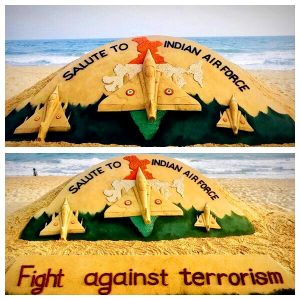ପୁରୀ: ପାକିସ୍ତାନ ସୀମାରେ ଭାରତୀୟ ବାୟୁସେନା ପକ୍ଷରୁ ମଙ୍ଗଳବାର ଦିନ ସକାଳେ ଆକ୍ରମଣ କରାଯାଇ ୩୦୦ ରୁ ଅଧିକ ଆତଙ୍କବାଦୀଙ୍କୁ ନିପାତ କରିଥିବା ଲାଗି ପ୍ରଖ୍ୟାତ ବାଲୁକା ଶିଳ୍ପୀ ସୁଦର୍ଶନ ପଟ୍ଟନାୟକ ତାଙ୍କର ଏକ ସୁନ୍ଦର ବାଲୁକା କଳା ମାଧ୍ୟମରେ ବାୟୁସେନାର ଯବାନଙ୍କୁ ଧନ୍ୟବାଦ ଜ୍ଞାପନ କରିଛନ୍ତି ।