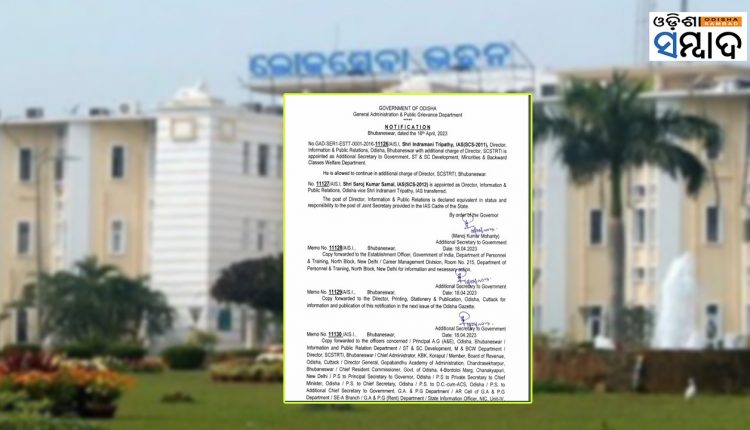 ସେହିପରି ସୂଚନା ଓ ଲୋକସଂପର୍କ ବିଭାଗର ନିର୍ଦ୍ଦେଶକ ଥିବା ୨୦୧୧ କ୍ୟାଡର ଆଇଏଏସ୍ ଇନ୍ଦ୍ରମଣୀ ତ୍ରିପାଠୀଙ୍କୁ ବଦଳି ହୋଇଛି। ଶ୍ରୀ ତ୍ରିପାଠୀଙ୍କୁ ଅନୁସୂଚିତ ଜାତି ଓ ଅନୁସୂଚିତ ଜନଜାତି, ସଂଖ୍ୟାଲଘୁ ଓ ପଛୁଆବର୍ଗ ବିଭାଗରେ ଅତିରିକ୍ତ ସଚିବ ଭାବେ ନିଯୁକ୍ତି ମିଳିଛି। ଏଥି ସହିତ ଶ୍ରୀ ତ୍ରିପାଠୀ ଏସ୍ସିଏସ୍ଟିଆରଟିଆଇ ବିଭାଗର ଅତିରିକ୍ତ ଦାୟିତ୍ବ ତୁଲାଇବେ। ଏନେଇ ସାଧାରଣ ପ୍ରଶାସନ ବିଭାଗ ପକ୍ଷରୁ ବିଧିବଦ୍ଧ ବିଜ୍ଞପ୍ତି ପ୍ରକାଶ ପାଇଛି।