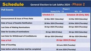 ଦ୍ୱିତୀୟ ପର୍ଯ୍ୟାୟରେ ବାହ୍ୟ ମଣିପୁର ସଂସଦୀୟ ନିର୍ବାଚନ ମଣ୍ଡଳୀରେ ଆଂଶିକ ମତଦାନ ସହିତ ଉପରୋକ୍ତ ୮୮ଟି ସଂସଦୀୟ କ୍ଷେତ୍ରରେ ନିର୍ବାଚନ ଆୟୋଜନ କରାଯିବ। ପ୍ରାର୍ଥୀପତ୍ର ଦାଖଲର ଶେଷ ତାରିଖ ହେଉଛି ୪ ଏପ୍ରିଲ ୨୦୨୪। ଜାମ୍ମୁ କାଶ୍ମୀରକୁ ଛାଡ଼ି ଅନ୍ୟ ୧୧ ରାଜ୍ୟ/କେନ୍ଦ୍ରଶାସିତ ପ୍ରଦେଶରେ ୫ ଏପ୍ରିଲ ୨୦୨୪ରେ ହେବ ପ୍ରାର୍ଥିପତ୍ର ଯାଞ୍ଚ; ଜାମ୍ମୁକାଶ୍ମୀରରେ ୬ ଏପ୍ରିଲ, ୨୦୨୪ ପ୍ରାର୍ଥିପତ୍ର ଯାଞ୍ଚ କରାଯିବ ।