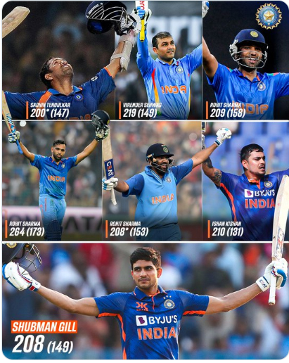 ଏଥିରେ ୭ଜଣ ଭାରତୀୟ କ୍ରିକେଟର ଏହି ସଫଳତା ହାସଲ କରିଛନ୍ତି । ୨୦୧୦ରେ ଦକ୍ଷିଣ ଆଫ୍ରିକା ବିପକ୍ଷରେ ସଚିନ ତେନ୍ଦୁଲକର ପ୍ରଥମ ଦ୍ୱିଶତକ ହାସଲ କରିଥିଲେ । ତାଙ୍କ ପରେ ବୀରେନ୍ଦ୍ର ସେହ୍ୱାଗ(୨୦୧୧), ରୋହିତ ଶର୍ମା (୨୦୧୩, ୨୦୧୪, ୨୦୧୭), ମାର୍ଟିନ ଗୁପଟିଲ (୨୦୧୫), କ୍ରିସ ଗେଲ (୨୦୧୫), ପଖର ଜମାନ (୨୦୧୮) ଓ ଈଶାନ କିଶାନ (୨୦୨୨) ଏହି ସଫଳତା ହାସଲ କରିଥିଲେ ।