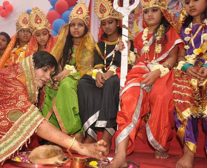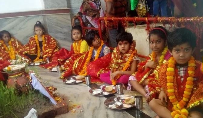 ନବରାତ୍ରିରେ ନଅ ଜଣ ଝିଅଙ୍କୁ ଭୋଜନ ଦେଇ ତୃପ୍ତ କରାଯାଏ । ଯେଉଁ କୁମାରୀ ପୂଜା ପାଇଁ ଉଦ୍ଦିଷ୍ଟ, ତାହା ଆଗରୁ ନିର୍ଦ୍ଦିଷ୍ଟ ହୋଇଥାଏ । କୁହାଯାଏ ନଅ ଜଣ ଝିଅ ଦେବୀ ଦୁର୍ଗାଙ୍କ ନଅଟି ରୂପ । ଏମାନଙ୍କ ସହ ଜଣେ ପୁଅଙ୍କୁ ବି ଭୋଜନ କରାଇବାର ଆବଶ୍ୟକତା ରହିଛି । କାରଣ ତାଙ୍କୁ ବଟୁକ ଭୈରବଙ୍କ ପ୍ରତୀକ ବୋଲି ବିବେଚନା କରାଯାଏ । ମାଆ ଦୁର୍ଗାଙ୍କ ସହ ଭୈରବଙ୍କ ପୂଜା ନିହାତି ଆବଶ୍ୟକ । ନଅ କନ୍ୟାଙ୍କ ବୟସ ୨ରୁ ୧୦ ବର୍ଷ ଭିତରେ ହୋଇଥିବ ।