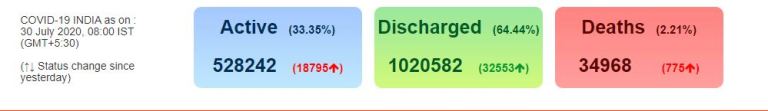 ଦେଶରେ ବର୍ତ୍ତମାନ ସୁଦ୍ଧା ଭୂତାଣୁ ସଂକ୍ରମିତ ହେଲେ ମୋଟ୍ ୧୫ ଲକ୍ଷ ୮୩ ହଜର ୭୯୨ । ପୂର୍ବରୁ ଗୋଟିଏ ଦିନରେ ପାଖାପାଖି ୫୦ ହଜାର ପଜିଟିଭ୍ ଚିହ୍ନଟ ହୋଇଥିଲେ । ଜୁଲାଇ ୨୭ ତାରିଖରେ ବାହାରିଥିଲେ ସର୍ବାଧିକ ୪୯ ହଜାର ୯୩୧ ନୂଆ ଆକ୍ରାନ୍ତ ।