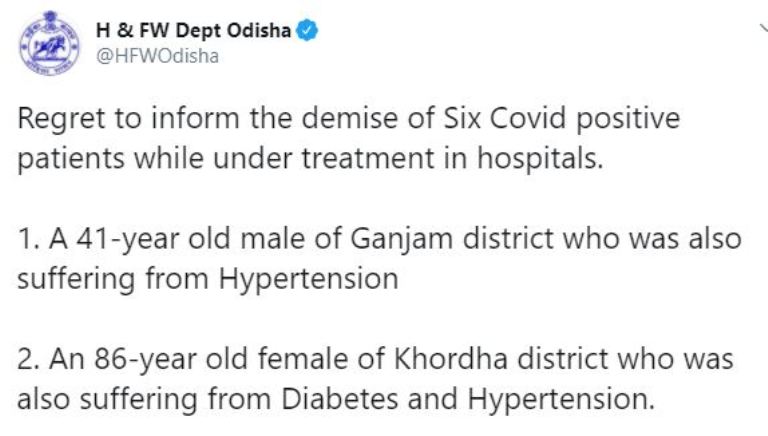 ମୃତକଙ୍କ ଭିତରେ ଗଞ୍ଜାମ ଜିଲ୍ଲାରୁ ୫ ଜଣ ଓ ଖୋର୍ଦ୍ଧା ଜିଲ୍ଲାର ଜଣେ ଭୂତାଣୁ ସଂକ୍ରମିତ ଅଛନ୍ତି । ଚାରି ଜଣ ପୁରୁଷ ଓ ଦୁଇ ମହିଳାଙ୍କ ମୁଣ୍ଡ ନେଇଛି କରୋନା । ଗଞ୍ଜାମ ଜିଲ୍ଲାର ୪୧ ବର୍ଷୀୟ, ୬୩ ବର୍ଷୀୟ ବ୍ୟକ୍ତି ଚିକିତ୍ସାଧୀନ ଅବସ୍ଥାରେ ମୃତ୍ୟବରଣ କରିଛନ୍ତି । ସେମାନଙ୍କର ଉଚ୍ଚ ରକ୍ତଚାପ ଥିଲା ।