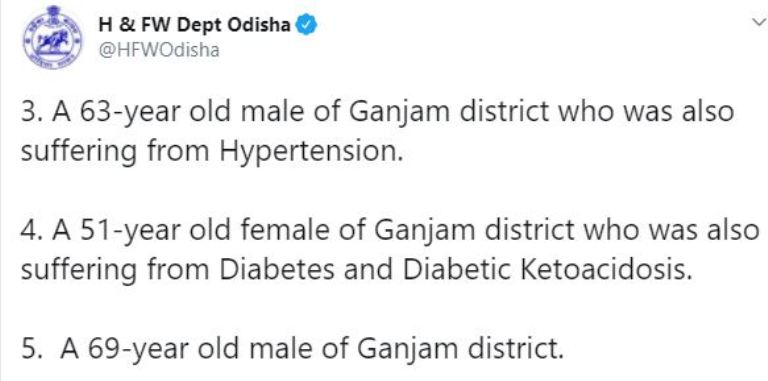ସେହିପରି ଡାଏବେଟିସ୍ ଓ ଉଚ୍ଚ ରକ୍ତଚାପ ଥିବା ଜିଲ୍ଲାର ଜଣେ ୫୭ ବର୍ଷୀୟ କରୋନା ସଂକ୍ରମିତଙ୍କ ମୃତ୍ୟୁ ହୋଇଛି । ଗଞ୍ଜାମ ଜିଲ୍ଲାର ଜଣେ ୫୧ ବର୍ଷୀୟ ମହିଳାଙ୍କ ବି ପ୍ରାଣ ନେଇଛି ପ୍ରାଣଘାତୀ ଭାଇରସ୍ । ସେ ଡାଏବେଟିସ୍ ଓ ଅନ୍ୟାନ୍ୟ ରୋଗରେ ପୀଡ଼ିତ ଥିଲେ । ଆଉ ଜଣେ ୬୯ ବର୍ଷୀୟ ବୃଦ୍ଧ ବି କରୋନାରେ ମୃତ୍ୟୁବରଣ କରିଛନ୍ତି ।