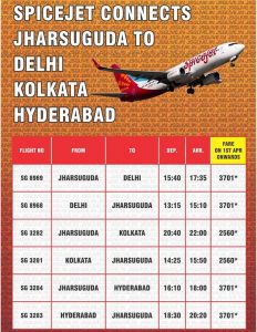 ନୂଆଦିଲ୍ଲୀ ଠାରେ ଝାରସୁଗୁଡା ବିମାନବନ୍ଦରରୁ ସ୍ପାଇଶଜେଟ୍ ଟିକେଟ୍ ବିକ୍ରିର ଶୁଭାରମ୍ଭ କରିବା ଅବସରରେ ଧର୍ମେନ୍ଦ୍ର ପ୍ରଧାନ କହିଛନ୍ତି ଯେ ସ୍ପାଇଶ ଜେଟ୍ ଝାରସୁଗୁଡା- ଦିଲ୍ଲୀ- ଝାରସୁଗୁଡା, ଝାରସୁଗୁଡା- ହାଇଦ୍ରାବାଦ-ଝାରସୁଗୁଡା, ଝାରସୁଗୁଡା- କୋଲକାତା-ଝାରସୁଗୁଡା ୬ ଟି ଗନ୍ତବ୍ୟ ସ୍ଥାନକୁ ଯୋଡିବ । ପ୍ରତିଦିନ ବିମାନ ଦିନ ୧.୧୫ରେ ଦିଲ୍ଲୀରୁ ବାହାରି ୩.୧୦ ରେ ଝାରସୁଗୁଡାରେ ପହଁଚିବ । ସେହିପରି ଝାରସୁଗୁଡାରୁ ଅପରାହ୍ଣ ୩.୪୦ରେ ବିମାନ ବାହାରି ୫.୩୫ରେ ଦିଲ୍ଲୀରେ ପହଁଚିବ । ଅପରପକ୍ଷେ ବିମାନଟି ୪.୧୦ରେ ଝାରସୁଗୁଡାରୁ ବାହରି ହାଇଦ୍ରାବାଦରେ ସନ୍ଧ୍ୟା ୬.୦୦ରେ ପହଁଚିବ ଏବଂ ହାଇଦ୍ରାବାଦରୁ ସାଢେ ୬ଟାରୁ ଉଡାଣ କରି ଝାସରୁଗୁଡାରେ ରାତି ୮.୨୦ ସୁଦ୍ଧା ପହଁଚିଯିବ ।