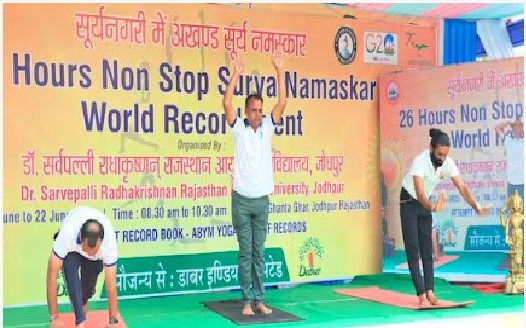 ରାଜସ୍ଥାନ ଯୋଧପୁରରେ ଆନ୍ତର୍ଜାତୀୟ ଯୋଗ ଦିବସ ପାଳିତ ହୋଇଥିଲା । ଏହି ଅବସରରେ ଯୋଧପୁରର ଆୟୁର୍ବେଦିକ ବିଶ୍ୱବିଦ୍ୟାଳୟ ଦ୍ୱାରା ସୂର୍ଯ୍ୟ ନମସ୍କାର ପ୍ରଦର୍ଶନ କରାଯାଇଥିଲା । ଯେଉଁଥିରେ ବିଶ୍ୱବିଦ୍ୟାଳୟର ଛାତ୍ରମାନେ ୨୬ ଘଣ୍ଟା ଧରି ସୂର୍ଯ୍ୟ ନମସ୍କାର କରି ଏହି ବିଶ୍ୱ ରେକର୍ଡ କରିଛନ୍ତି । ଛାତ୍ରଛାତ୍ରୀମାନେ ସକାଳ ୮ଟାରୁ ସୂର୍ଯ୍ୟ ନମସ୍କାର ଆରମ୍ଭ କରି ତାପରଦିନ ପୂର୍ବାହ୍ନ ସାଢେ୧୦ଟା ପର୍ଯ୍ୟନ୍ତ କ୍ରମାଗତ ଭାବରେ ସୂର୍ଯ୍ୟ ନମସ୍କାର ପ୍ରଦର୍ଶନ କରିଥିଲେ । ଯୋଗ ଏବଂ ସୂର୍ଯ୍ୟ ନମସ୍କାର ବିଷୟରେ ଲୋକଙ୍କ ମଧ୍ୟରେ ସଚେତନତା ଆଣିବା ଏହାର ମୂୂଳ ଉଦ୍ଦେଶ୍ୟ ଥିଲା ବୋଲି ଛାତ୍ରଛାତ୍ରୀ କହିଛନ୍ତି ।