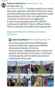 ପୁରୀ: ପୁରୀ ଶ୍ରୀଜଗନ୍ନାଥ ମନ୍ଦିର ନୀତି ଓ ପରମ୍ପରା ଆଧାରରେ ରଥଯାତ୍ରା କରିବାକୁ ସ୍କଟଲାଣ୍ଡର ସରକାରଙ୍କୁ ଅନୁରୋଧ କରିଛନ୍ତି ଆନ୍ତର୍ଜାତୀୟ ବାଲୁକା ଶିଳ୍ପୀ ପଦ୍ମଶ୍ରୀ ସୁଦର୍ଶନ ପଟ୍ଟନାୟକ । ଏନେଇ ସେଠାରେ ଥିବା ଭାରତୀୟ ଦୂତାବାସ ତରଫରୁ ସ୍କଟଲାଣ୍ଡରେ ହୋଇଥିବା ରଥଯାତ୍ରାକୁ ନେଇ ଟ୍ବିଟ୍ ର ଉତ୍ତର ଦେଇ ଏଭଳି ଲେଖିଛନ୍ତି ସୁଦର୍ଶନ ।