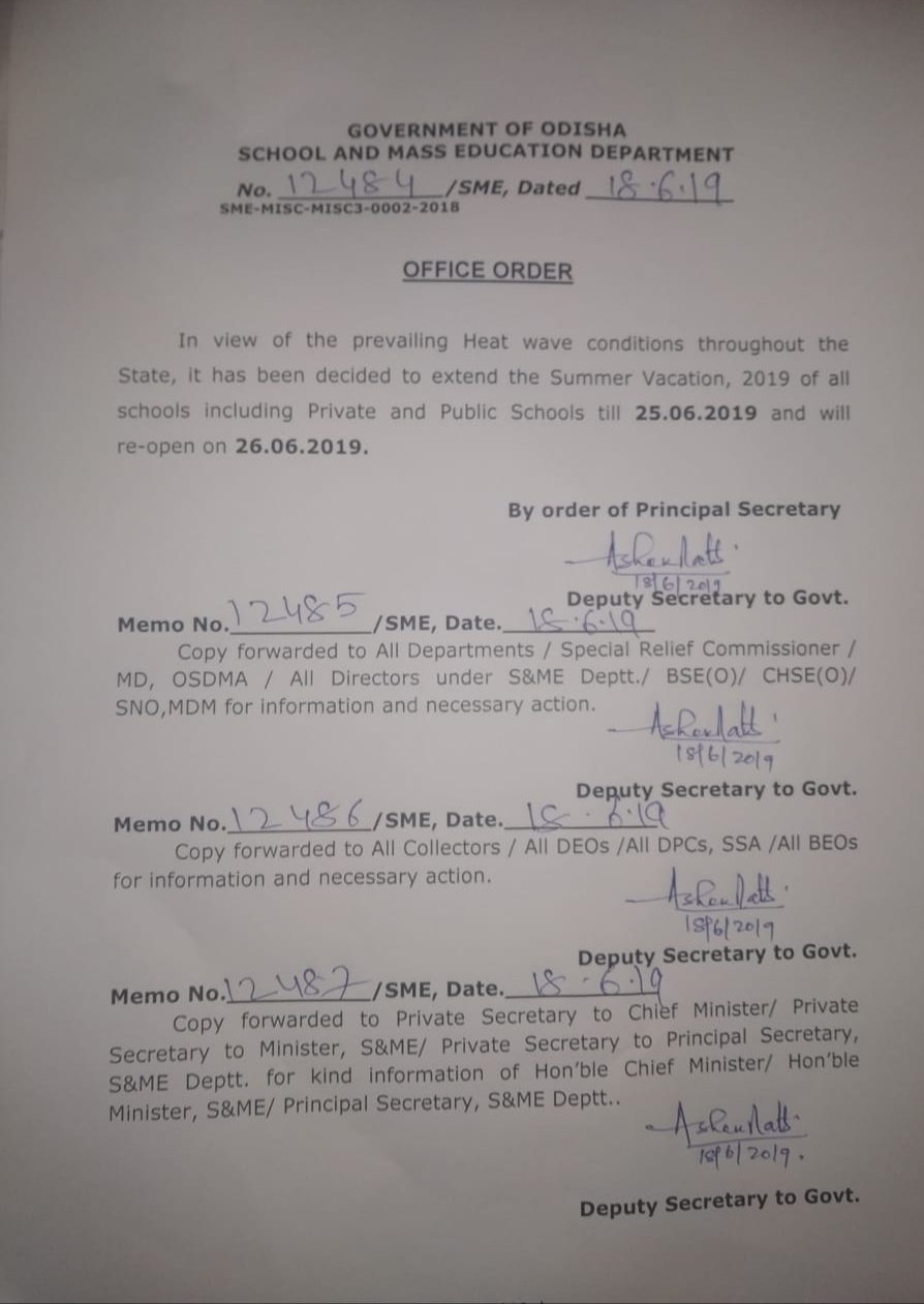 ସରକାରଙ୍କ ଏହି ନିର୍ଦ୍ଦେଶନାମା ଅନୁଯାୟୀ ରାଜ୍ୟର ସମସ୍ତ ବିଦ୍ୟାଳୟ ଗୁଡ଼ିକ ଜୁନ ୨୬ ତାରିଖରେ ପୁନର୍ବାର ଖୋଲିବ ।