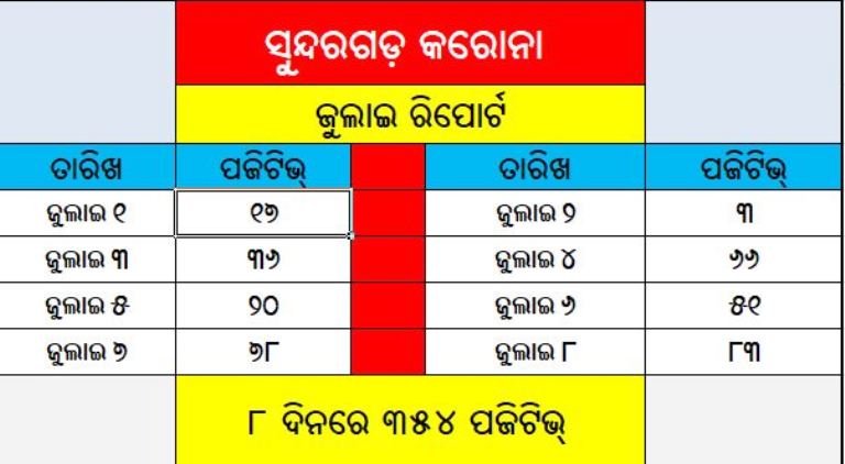 ସୁନ୍ଦରଗଡ଼ ପାଇଁ ଜୁଲାଇ ମାସ ଚିନ୍ତା ବଢ଼ାଇଲାଣି । ଗତ ୧ ତାରଖରୁ ଲଗାତାର ପଜିଟିଭ୍ କେସ୍ ବଢୁଛି । ଗତ ୮ ଦିନ ଭିତରେ ଚିହ୍ନଟ ହୋଇଛନ୍ତି ମୋଟ୍ ୩୫୪ ଭୂତାଣୁ ସଂକ୍ରମିତ । ଜିଲ୍ଲାର ମୋଟ୍ ଆକ୍ରାନ୍ତଙ୍କ ୬୮ ପ୍ରତିଶତ କେବଳ ଜୁଲାଇର ଏହି ଆଠ ଦିନରେ ବାହାରିଛନ୍ତି ।