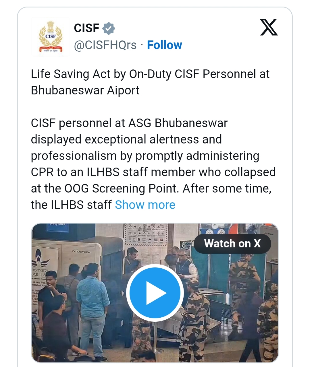 ଏନେଇ X ରେ ଏକ ପୋଷ୍ଟ ସେୟାର କରି ସିଆଇଏସଏଫ କହିଛି ଯେ ଡି ପି ଗୁପ୍ତାଙ୍କ ସହାୟତାରେ ଓ ଡିମ୍ପଲ କୁମାରଙ୍କ ଦ୍ଵାରା ଏକ ମୂଲ୍ୟବାନ ଜୀବନ ବଞ୍ଚିପାରିଛି। ଏହି ସାହସିକ କାର୍ଯ୍ୟକୁ ଘଟଣାସ୍ଥଳରେ ଉପସ୍ଥିତ ଜଣେ ଡାକ୍ତର ମଧ୍ୟ ଉଚ୍ଚ ପ୍ରଶଂସା କରିଥିଲେ।