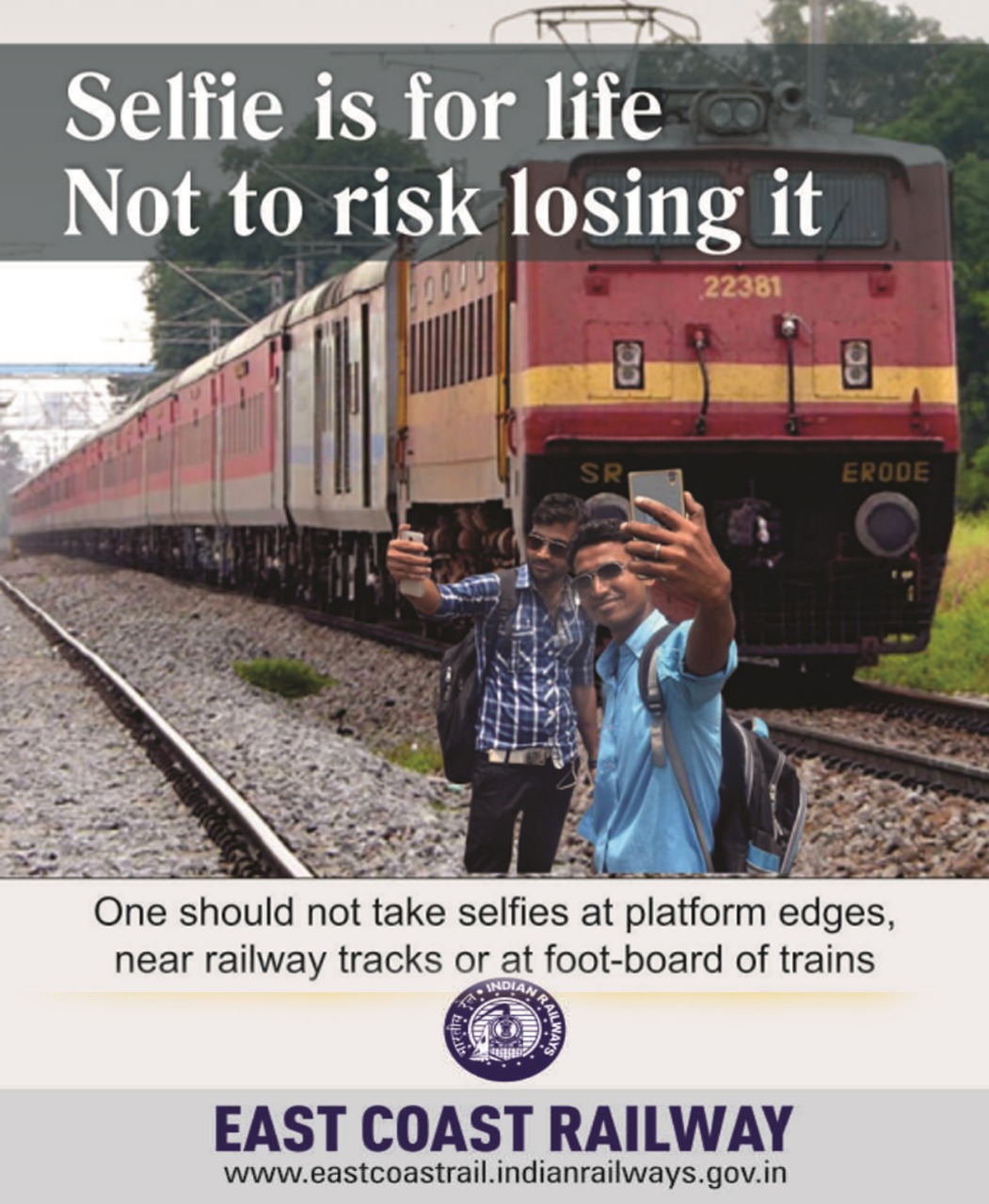 ବହୁ ଘଟଣା ରେ ଦେଖାଯାଉଛି ଯେ ଯୁବ ବର୍ଗର ପିଲାମାନେ ଟ୍ରେନ କିମ୍ବା ଟ୍ରେନ ଇଂଜିନ ର ଛାତ ଉପରକୁ ଚଢି କିମ୍ବା ଟ୍ରେନ ଆସୁଥିବା ବେଳେ ରେଳଧାରଣ ପାଖରେ ବିପଦକୁ ଭୃକ୍ଷେପ ନକରି ସେମାନଙ୍କର ମୂଲ୍ୟବାନ ଜୀବନ ପ୍ରତି ଚିନ୍ତା ନକରି ସେଲ୍ଫି ଉଠାଉଛନ୍ତି I ଏହା ଆହୁରି ମଧ୍ୟ ଦେଖାଯାଏ ଯେ ପିଲାମାନେ ଟ୍ରେନ ଚାଳକ ମାନଙ୍କର ବାରମ୍ବାର ହୁଇସିଲ କୁ କର୍ଣ୍ଣପାତ ନକରି ଚଳନ୍ତା ଟ୍ରେନ ଆଗରେ ସେଲ୍ଫି ଉଠାଉଛନ୍ତି I