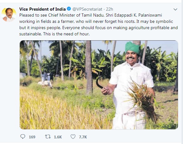 ଉପରାଷ୍ଟ୍ରପତି କହିଛନ୍ତି ଯେ, ତାମିଲନାଡୁ ମୁଖ୍ୟମନ୍ତ୍ରୀ ଚାଷ ଜମିରେ ଜଣେ କୃଷକ ଭାବେ କାମ କରୁଛନ୍ତି । ମୁଖ୍ୟମନ୍ତ୍ରୀ ହେଲେ ବି ସିଏ ନିଜର ପରମ୍ପରାକୁ ଭୁଲି ନାହାନ୍ତି । ଏହା ଦେଖି ମୋତେ ଅତ୍ୟନ୍ତ ଖୁସି ଲାଗୁଛି । ଏହି ଫଟୋରୁ ଲୋକେ ପ୍ରେରଣା ଲାଭ କରିବେ । କୃଷିକୁ ଲାଭଦାୟକ କରାଯିବା ଦିଗରେ କାମ ହେବା ଦରକାର ବୋଲି କହିଛନ୍ତି ଉପରାଷ୍ଟ୍ରପତି ।