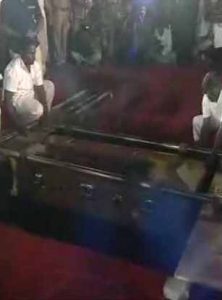 ବହୁ ବାଦବିବାଦ ପରେ ତାଙ୍କ ମରଶରୀରକୁ ଏକ ବିରାଟ ଶୋଭାଯାତ୍ରାରେ ମାରିନା ବିଚକୁ ନିଆଯାଇଥିଲା । ମାରିନା ବିଚରେ ଅତ୍ୟନ୍ତ ଶୋକାକୁଳ ପରିବେଶରେ ତାମିଲନାଡୁର ପୂର୍ବତନ ମୁଖ୍ୟମନ୍ତ୍ରୀ ସି ଏନ୍ ଆନ୍ନାଦୁରାଇଙ୍କ ସମାଧିସ୍ଥଳ ନିକଟରେ ତାଙ୍କୁ କବର ଦିଆଯାଇଥିଲା । ପରେପରେ କରୁଣାନିଧିଙ୍କ କଫିନରେ ଲେଖାଯାଇଥିବା କିଛି ଶବ୍ଦକୁ ନେଇ ସବୁଠି ଚର୍ଚ୍ଚା । ସବୁ ଶବ୍ଦଗୁଡିକ ତାମିଲରେ ଲେଖାଯାଇଥିବାରୁ ଏହାର ଅର୍ଥ ଜାଣିବା ପାଇଁ ସମସ୍ତଙ୍କର ଆବେଗ ବଢିଥିଲା ।