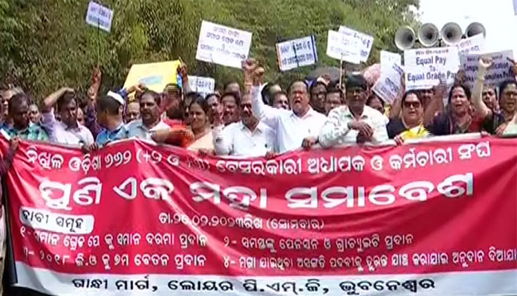 ଭୁବନେଶ୍ୱର: ନିଖିଳ ଓଡ଼ିଶା ୬୬୨ (+୨, +୩) ବେସରକାରୀ ଅଧ୍ୟାପକ ଓ କର୍ମଚାରୀ ସଙ୍ଘର ସଦସ୍ୟମାନେ ନିଜର ୪ ଦଫା ଦାବି ପୂରଣ ପାଇଁ ଭୁବନେଶ୍ୱରରେ ଏକ ବିଶାଳ ସମାବେଶର ଆୟୋଜନ କରିଥିଲେ। ବିକ୍ଷୋଭକାରୀମାନେ ମାଷ୍ଟରକ୍ୟାଣ୍ଟିନରୁ ରାଲି ଆରମ୍ଭ କରି ମୁହଁରେ କଳା ଟେପ୍ ବାନ୍ଧି ଲୋୟର ପିଏମଜି ଅଭିମୁଖେ ଯାଇଥିଲେ। ବିଭିନ୍ନ ଦାବି ନେଇ ସେମାନେ ଓଡ଼ିଶା ସରକାରଙ୍କ ବିରୋଧରେ ନାରାବାଜି କରିଥିଲେ।