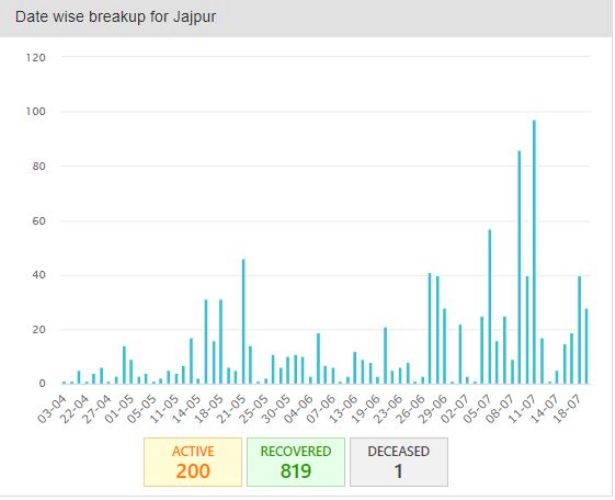 ଯାଜପୁର ଜିଲ୍ଲାରେ ସୁସ୍ଥ ହୋଇ କୋଭିଡ୍ ହସ୍ପିଟାଲରୁ ଫେରିଛନ୍ତି ୮୧୯ ଆକ୍ରାନ୍ତ । ବର୍ତ୍ତମାନ ଆକ୍ଟିଭ୍ କେସ ରହିଛି ୨୦୦ । ଜଣେ କରୋନା ଆକ୍ରାନ୍ତଙ୍କ ମୃତ୍ୟୁ ହୋଇଛି ।