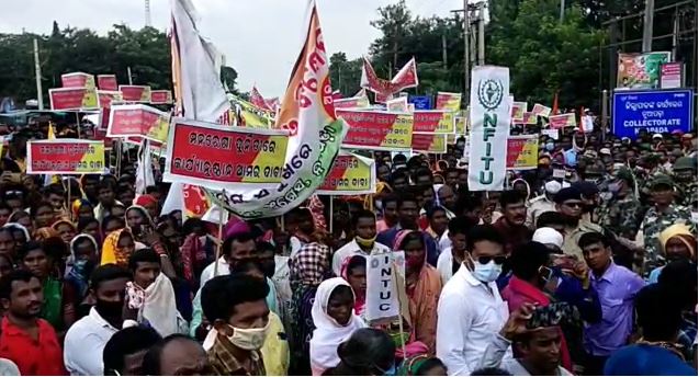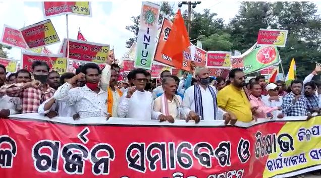 ଏକ ବିଶାଳ ଶୋଭାଯାତ୍ରାରେ ବାହାରି ସହର ପରିକ୍ରମା କରି ଜିଲ୍ଲାପାଳଙ୍କ କାର୍ଯ୍ୟାଳୟ ସମ୍ମୁଖରେ ବିକ୍ଷୋଭ ପ୍ରଦର୍ଶନ ସହ ପ୍ରତିବାଦ ସଭା କରିଛନ୍ତି ଶ୍ରମିକ । ସରକାରଙ୍କ ଶ୍ରମିକ ମାରଣା ନୀତିକୁ କଡ଼ା ବିରୋଧ କରିଛନ୍ତି ।