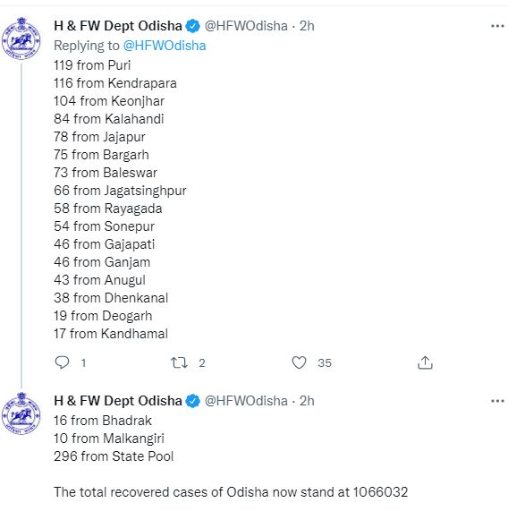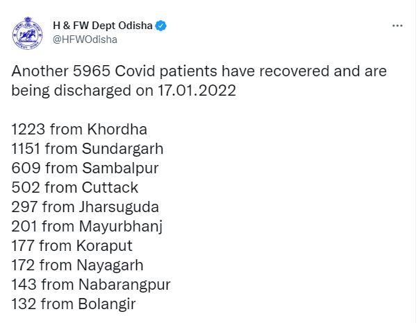 ସୁନ୍ଦରଗଡ଼ ଜିଲ୍ଲାରୁ ୧୧୫୧ ଜଣ, ସମ୍ବଲପୁରରୁ ୬୦୯, କଟକରୁ ୫୦୨, ଝାରସୁଗୁଡ଼ାରୁ ୨୯୭, ମୟୂରଭଂଜରୁ ୨୦୧, କୋରାପୁଟରୁ ୧୭୭, ନୟାଗଡ଼ରୁ ୧୭୨, ନବରଂଗପୁରରୁ ୧୪୩ ଓ ବଲାଙ୍ଗୀରରୁ ୧୩୨, ପୁରୀରୁ ୧୧୯, କେନ୍ଦ୍ରାପଡ଼ାରୁ ୧୧୬, କେନ୍ଦୁଝରରୁ ୧୦୪, କଳାହାଣ୍ଡିରୁ ୮୪, ଯାଜପୁରରୁ ୭୮, ବରଗଡ଼ରୁ ୭୫, ବାଲେଶ୍ୱରରୁ ୭୩, ଜଗତସିଂହପୁରରୁ ୬୬, ରାୟଗଡ଼ାରୁ ୫୮, ସୁବର୍ଣ୍ଣପୁରରୁ ୫୪, ଗଜପତି, ଗଂଜାମରୁ ୪୬ ଜଣ, ଅନୁଗୁଳରୁ ୪୩, ଢେଙ୍କାନାଳରୁ ୩୮, ଦେବଗଡ଼ରୁ ୧୯, କନ୍ଧମାଳରୁ ୧୭, ଭଦ୍ରକରୁ ୧୬, ମାଲକାନଗିରିରୁ ୧୦ ଓ ରାଜ୍ୟପୁଲରୁ ୨୯୬ ଜଣ ଆକ୍ରାନ୍ତ କରୋନାରୁ ସୁସ୍ଥ ହୋଇଛନ୍ତି।