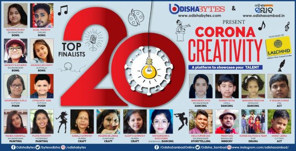 ଭୁବନେଶ୍ୱର : ଅଗ୍ରଣୀ ଡିଜିଟାଲ ଗଣମାଧ୍ୟମ www.odishasambad.in ଏବଂ www.odishabytes.com ନିବେଦିତ କରୋନା କ୍ରିଏଟିଭିଟି ପ୍ରତିଯୋଗିତାରେ ଟପ୍ ୨୦ ତାଲିକା ପ୍ରକାଶ ପାଇଛି । ଟପ୍ ୨୦ ରେ ସ୍ଥାନ ପାଇଥିବା ପ୍ରତିଯୋଗୀମାନେ ହେଲେ – ସଙ୍ଗୀତଗାନରେ ଭୁବନେଶ୍ୱରର ମୌମିତା ଦେ ରୟ, ଶାଶ୍ୱତୀ ନାରାୟଣୀ ଆଚାର୍ଯ୍ୟ, ଗଂଜାମର ସୁଜଲ ତ୍ରିପାଠୀ, ଅଷ୍ଟ୍ରେଲିଆରୁ ଅନୁଷ୍କା ମହାନ୍ତି; ଗୀତ ଆବୃତ୍ତିରେ କଟକର ସୌମ୍ୟାଶ୍ରୀ ଶୁକ୍ଲା, ଉତ୍ପଳାକ୍ଷ ଜେନା, ପେଣ୍ଟିଂରେ ଭୁବନେଶ୍ୱରର ମେହେକ ଅଗ୍ରୱାଲ ଓ ହାଇଦ୍ରାବାଦରୁ ପୂଜିତା ମହାନ୍ତି  ।