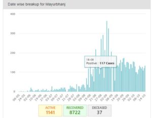 ଆସନ୍ତାକାଲି ମୟୂରଭଞ୍ଜ ଜିଲ୍ଲାରେ ଦଶ ହଜାର ଛୁଇଁପାରେ କରୋନା ଆକ୍ରାନ୍ତଙ୍କ ସଂଖ୍ୟା । ୨୪ ଘଣ୍ଟାରେ ଆଉ ୧୩୪ ନୂଆ ଆକ୍ରାନ୍ତ ଚିହ୍ନଟ ହୋଇଛନ୍ତି । ମୋଟ୍ ୯ ହଜାର ୯୦୩ ଆକ୍ରାନ୍ତଙ୍କ ମଧ୍ୟରୁ ୮ ହଜାର ୭୨୨ ଆରୋଗ୍ୟ ଲାଭ କରିଛନ୍ତି । ୧୧ ଶହ ୪୧ଟି ରହିଛି ସକ୍ରିୟ କେସ୍ ।