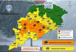 - ଆଜି ପ୍ରବଳରୁ ଅତି ପ୍ରବଳ ବର୍ଷା ସମ୍ଭାବନା ଲାଗି ରହିବ । ଦକ୍ଷିଣ ଉପକୂଳ ଓ ଏହାର ଆଖପାଖରେ ସ୍ପଷ୍ଟ ଚିହ୍ନିତ ଲଘୁଚାପ କ୍ଷେତ୍ର ପ୍ରଭାବରେ ଆସନ୍ତା ୪ ଦିନ ପର୍ଯ୍ୟନ୍ତ ରାଜ୍ୟର ବିଭିନ୍ନ ସ୍ଥାନରେ ପ୍ରବଳ ବର୍ଷା ସମ୍ଭାବନା ରହିଛି। ଏନେଇ ଭୁବନେଶ୍ୱର ସ୍ଥିତ ଆଞ୍ଚଳିକ ପାଣିପାଗ ବିଜ୍ଞାନ କେନ୍ଦ୍ର ପକ୍ଷରୁ ପୂର୍ବାନୁମାନ କରାଯାଇଛି । ଆଜି ପାଇଁ ୫ ଜିଲ୍ଲାକୁ ଅରେଞ୍ଜ ଓ୍ୱାର୍ଣ୍ଣିଂ ଜାରି କରାଯାଇଥିବା ବେଳେ ୧୭ ଜିଲ୍ଲାକୁ ୟେଲୋ ଓ୍ୱାର୍ଣ୍ଣିଂ ଜାରି ହୋଇଛି