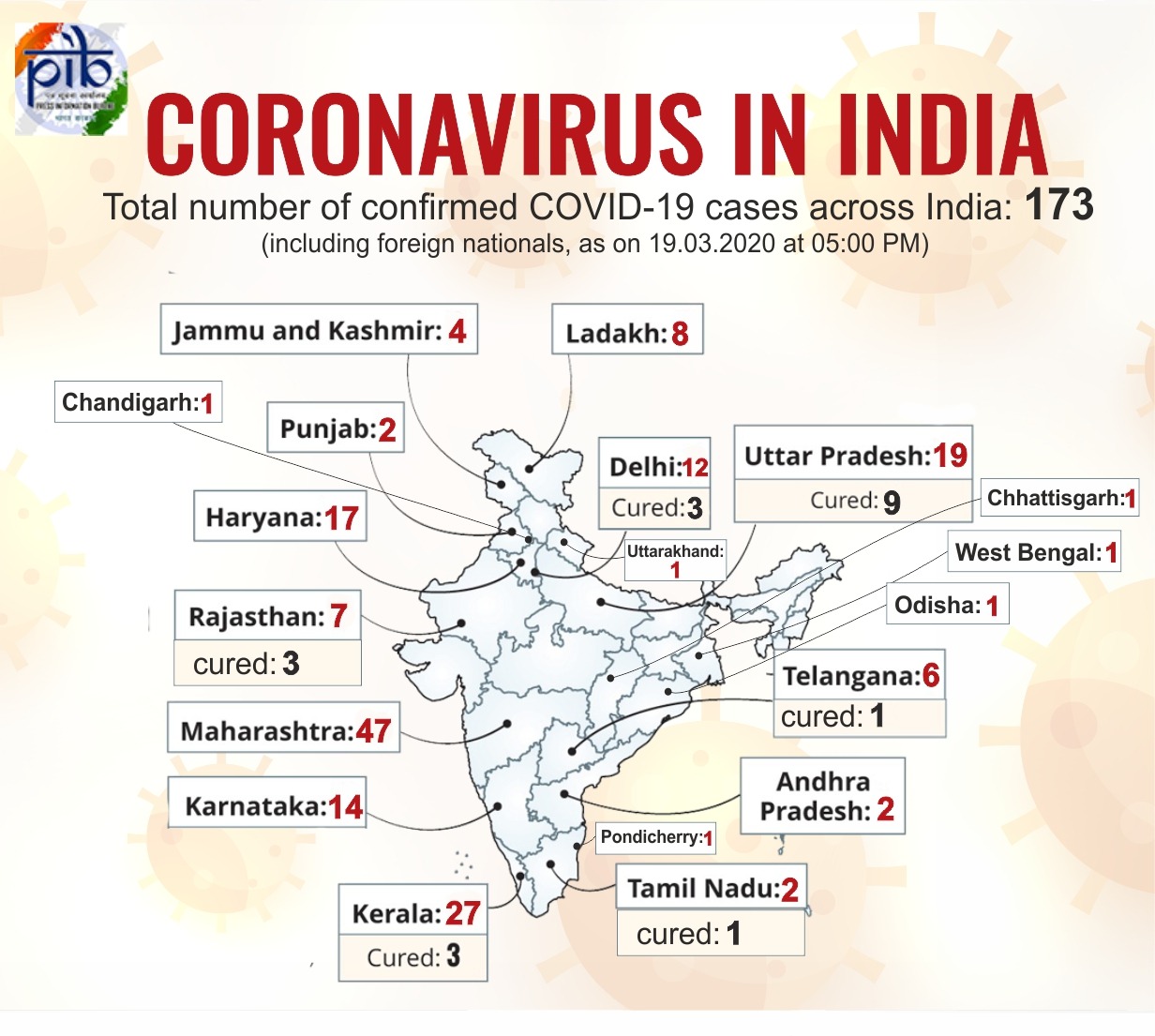 ଆଜିର ନୂଆ ରିପୋର୍ଟ ଅନୁସାରେ ଜମ୍ମୁ ଓ କାଶ୍ମୀରରେ ୪, ଚଣ୍ଡିଗଡରେ ୧, ପଞ୍ଜାବରେ ୨, ହରିୟାଣାରେ ୧୭, ରାଜସ୍ଥାନରେ ୭, ମହାରାଷ୍ଟ୍ରରେ ସର୍ବାଧିକ ୪୭ଜଣ କରୋନା ଦ୍ୱାରା ଆକ୍ରାନ୍ତ ହୋଇଛନ୍ତି । ସେହିଭଳି କରୋନାଭାଇରସ ଦ୍ୱାରା କର୍ଣ୍ଣାଟକରେ ୧୪, କେରଳରେ ୨୭, ତାମିଲନାଡୁରେ ୨, ଆନ୍ଧ୍ର ପ୍ରଦେଶରେ ୨, ତେଲେଙ୍ଗାନାରେ ୬, ଲଦାଖରେ ୮, ଦିଲ୍ଲୀରେ ୧୨, ଉତ୍ତର ପ୍ରଦେଶରେ ୧୯ ଏବଂ ଓଡିଶା, ପଶ୍ଚିମବଙ୍ଗ ଓ ଛତିଶଗଡ ପ୍ରତ୍ୟେକ ରାଜ୍ୟରେ ଜଣେ ଜଣେ ଲେଖାଏଁ ଆକ୍ରାନ୍ତ ହୋଇଛନ୍ତି ।