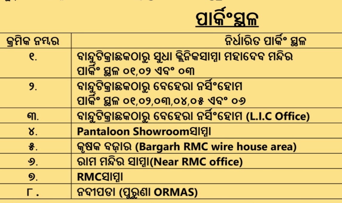 କିନ୍ତୁ ଏହି କଟକଣା ତଥା ନିୟମ ଆମ୍ବୁଲାନ୍ସ, ଅଗ୍ନିଶମ ବାହିନୀ, ପୋଲିସ ଓ ତତ୍ ସମ୍ପର୍କିତ ଗାଡ଼ିଗୁଡ଼ିକ ନିମନ୍ତେ ମଧ୍ୟ ଲାଗୁ ହେବ ନାହିଁ। ସୋହେଲା, ଭଟଲି ପାର୍ଶ୍ବରୁ ଆସୁଥିବା ହାଲୁକା ଯାନବାହନ ଗୁଡିକ ବାନ୍ଦୁଟିକ୍ରାଛକର ବାମ ପାର୍ଶ୍ବରେ ପାର୍କିଂ ଜାଗାରେ ପାର୍କ କରିବେ। ସେହିପରି ଜାଣନ୍ତୁ ଆଉ କେଉଁ ସ୍ଥାନରେ ପାର୍କିଂ ବ୍ୟବସ୍ଥା କରାଯାଇଛି…
