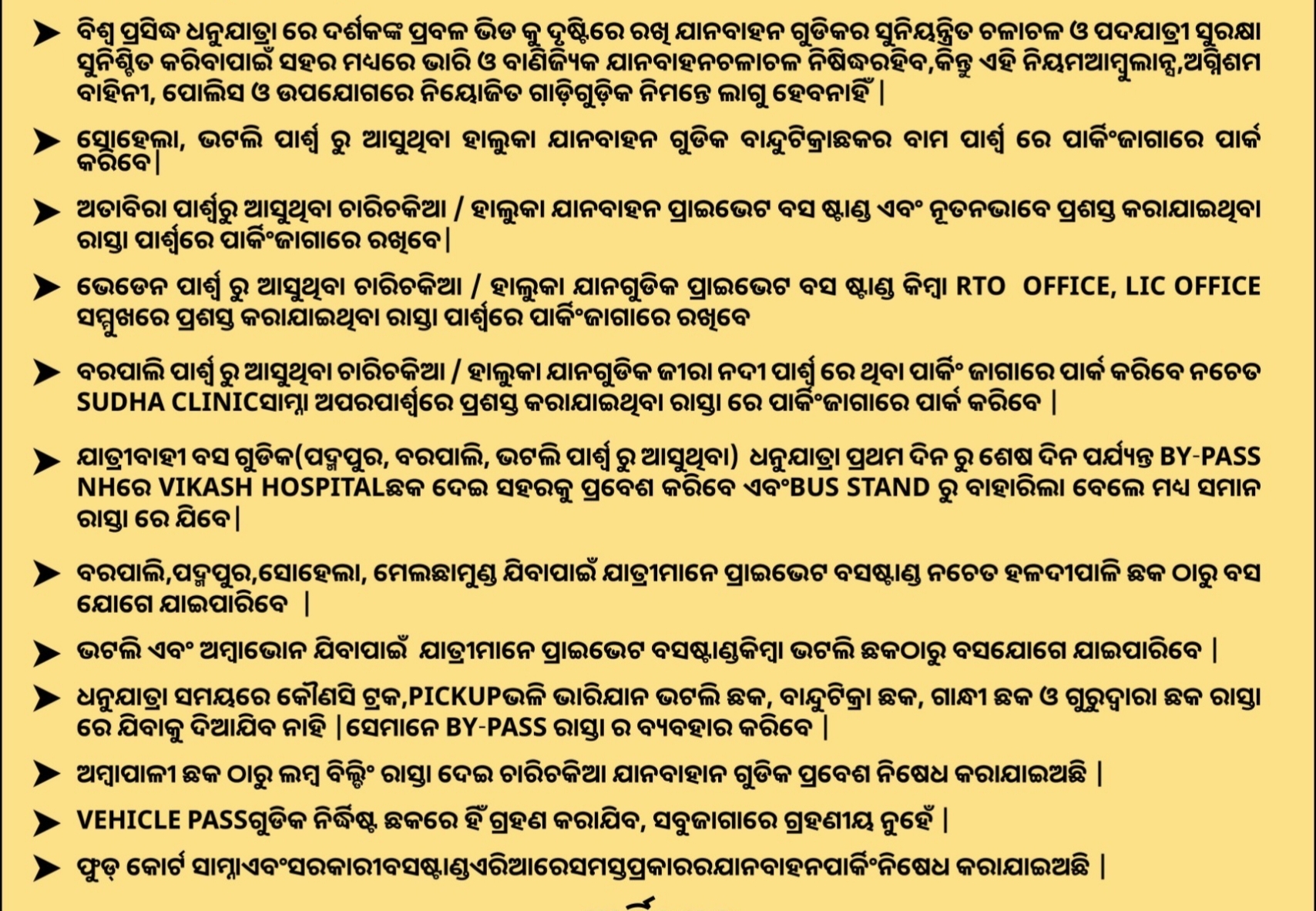ଏହାକୁ ଦୃଷ୍ଟିରେ ରଖି ବରଗଡ ସହରର ବିଭିନ୍ନ ରାସ୍ତା ମାନଙ୍କରେ ଯାନବାହନ ଗୁଡିକର ସୁନିୟନ୍ତ୍ରିତ ଚଳାଚଳ ତଥା ଜନସାଧାରଣ ଓ ପଥଚାରୀଙ୍କ ସୁବିଧା ଉଦ୍ଦେଶ୍ୟରେ ଓଡିଶା ପୋଲିସ ଆଇନ ୨୦୦୩ ଧାରା ୨୮ ଅନୁସାରେ ନିମ୍ନଲିଖିତ କଟକଣା ଗୁଡିକ ଲାଗୁ କରାଯାଇଛି। ଏହି କଟକଣା ଅପରାହ୍ନ ୦୨ ଘଣ୍ଟା ଠାରୁ ରାତ୍ର ୧୧:୩୦ ଘଣ୍ଟା ପର୍ଯ୍ୟନ୍ତ ଲାଗୁ ହେବ।
